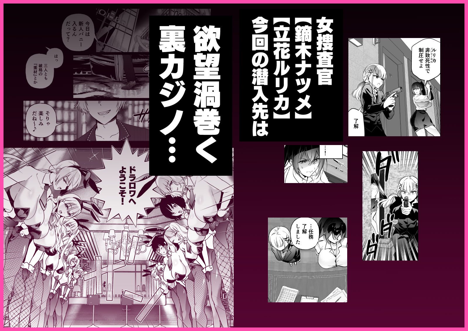 サークル「クゥロン」がおくる最新漫画「潜入堕兎ナツメ【前編】〜エリート女捜査官が裏カジノの罠にハメられゲス客のオナホになる話〜」の無料サンプル画像・あらすじを紹介しています。